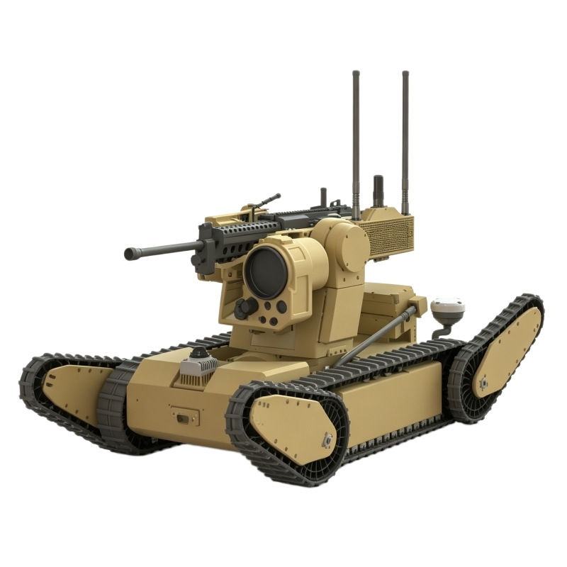 Armed reconnaissance robot equipped with an M249 machine gun (customizable). Weighing only 100kg, it features autonomous target recognition, tracking, and engagement, plus day/night multi‑spectral reconnaissance. Dual‑redundant control and intelligent protection ensure safe operation in urban, ruin, and field combat environments.